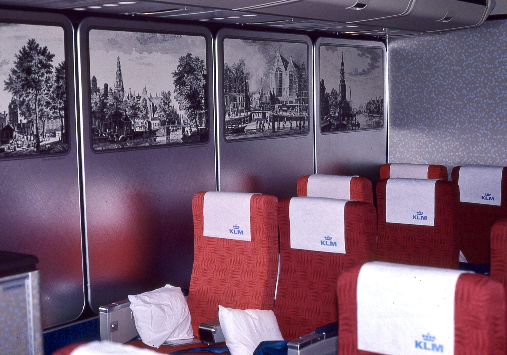 KLMオランダ航空ジャンボの機内 壁の向こうは縦長ギャレーです