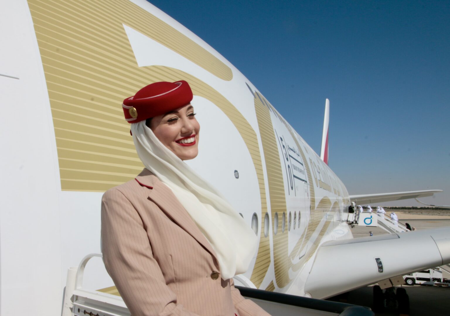 ドバイエアショー2021会場でのエミレーツ航空A380ドア前で微笑む客室乗務員