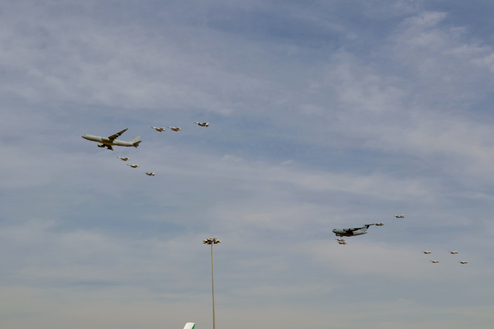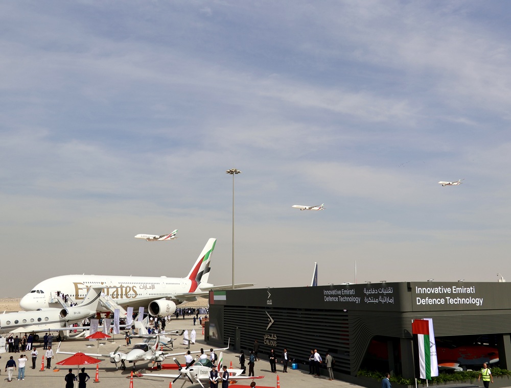 オープニングを飾ったのは、UAE軍のヘリコプターと軍用機による編隊、そしてエミレーツ航空のワイドボディ旅客機の編隊飛行です。このエミレーツ編隊では、2024年11月に初納入されたエアバスA350が空中編隊飛行に初めて参加するという瞬間を迎えました。