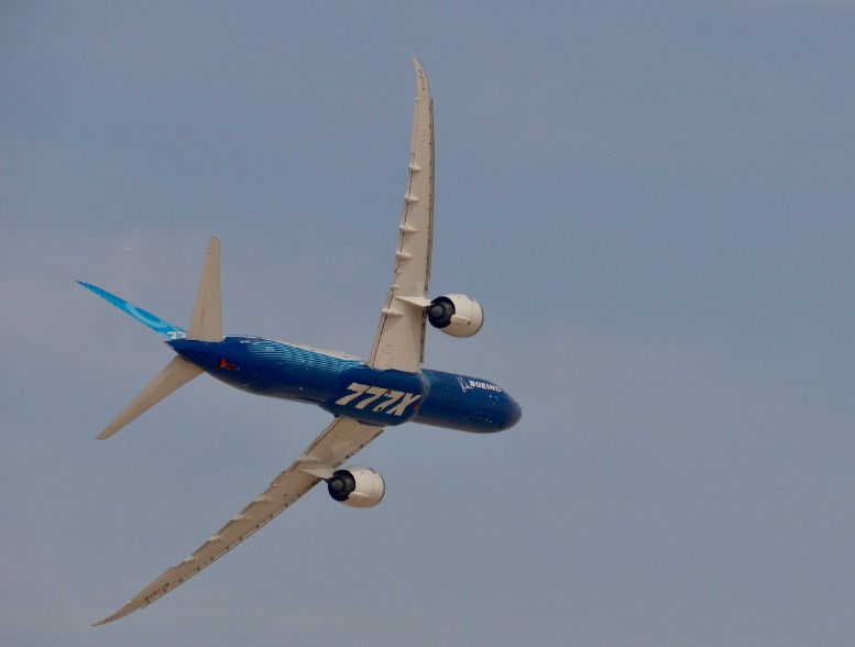 まず登場したのは、ボーイングの次世代フラッグシップであるボーイング777X-9です。世界最大の双発ジェット機として知られる777Xは、その巨大な機体からは想像もつかない俊敏な動きを披露しました。