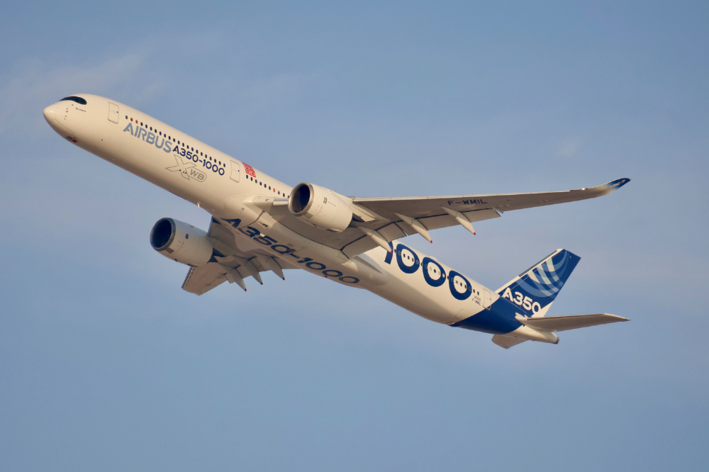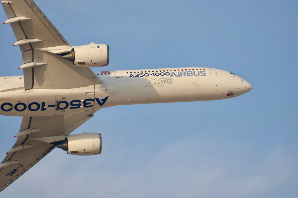 ボーイング777Xのライバル機であるエアバスA350-1000は、長大な機体と洗練されたデザインが特徴です。A350-1000のデモフライトは、777Xの力強い展示とは対照的に、一貫してスムーズで優雅な動きで展開されました。