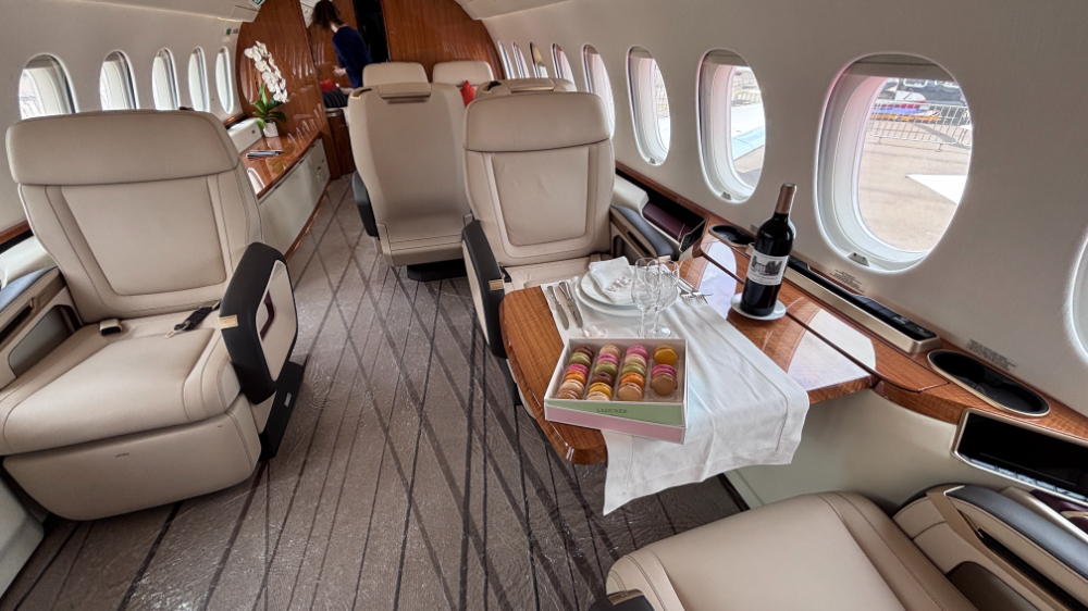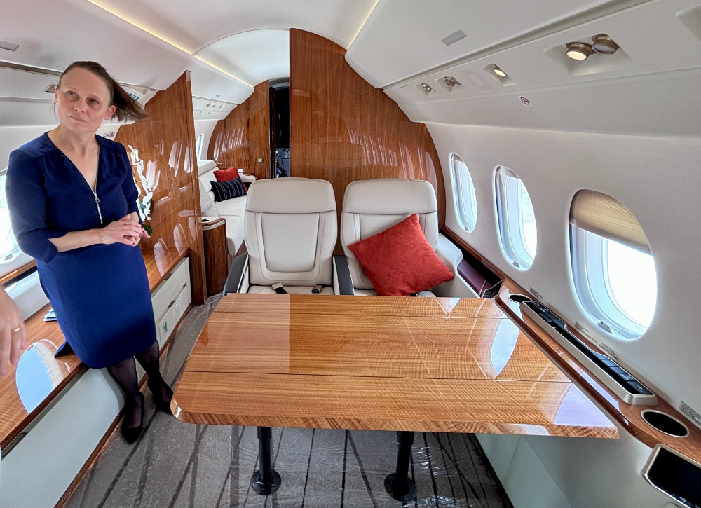 地上展示された機内に足を踏み入れると、まずその開放感に気付きます。従来の細長いビジネスジェットのイメージを覆すほど横幅が広く、まるで高級ホテルのラウンジをそのまま空に持ち出したかのような空間が広がっています。ダッソーは、この広さを活かして3つの独立したラウンジエリアを設けており、仕事、食事、休息といった用途に合わせて機内を使い分けることが可能です。